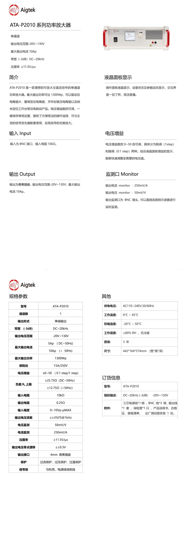 产品名称:Aigtek安泰/ATA-P2010系列/功率放大器